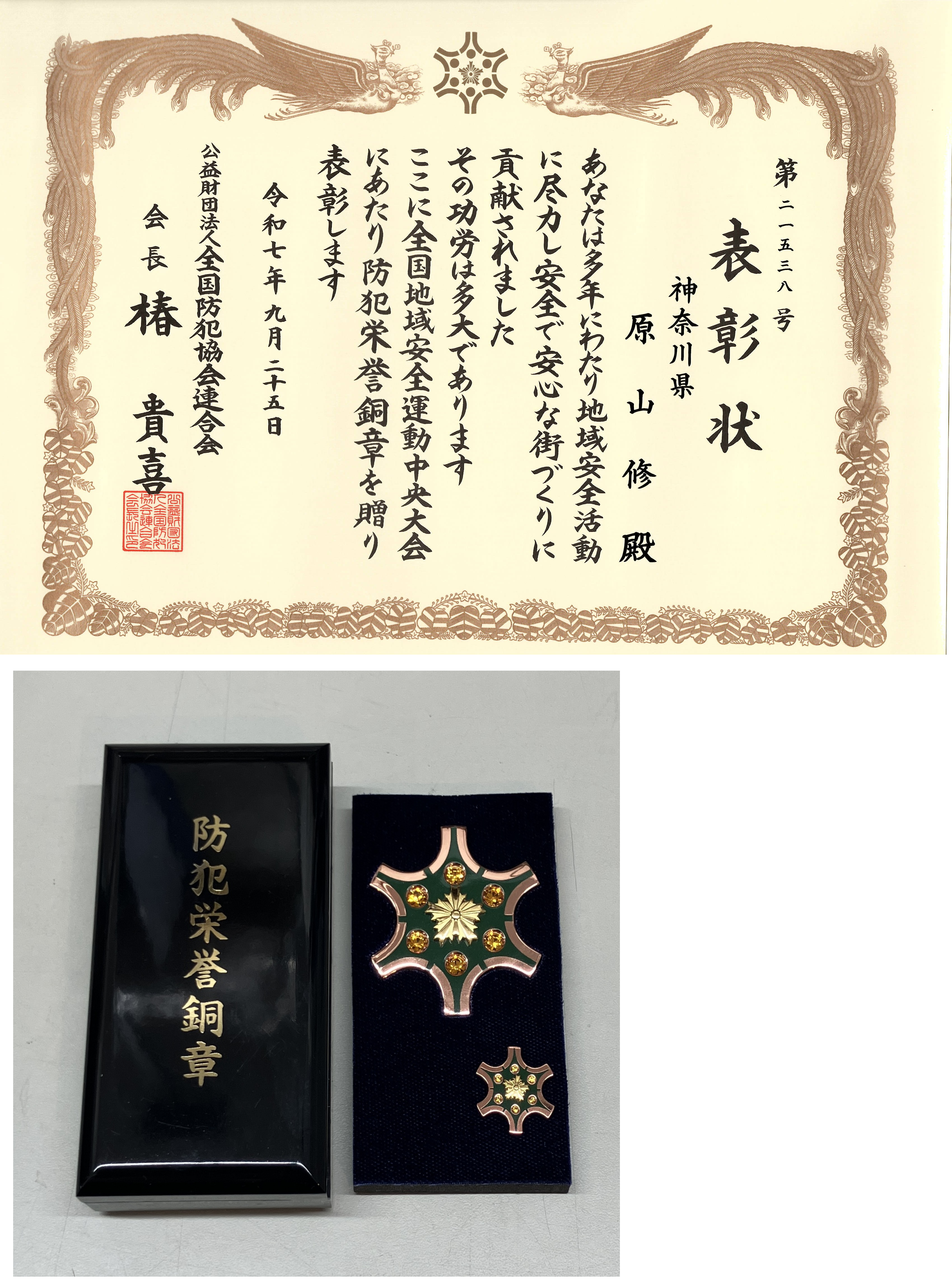 ◇「多年にわたり地域安全活動に尽力し安心な街づくりに貢献した」として、全国防犯協会連合会より防犯栄誉銅章を授与される(9月)